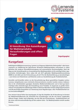 KI-basierte Medizinprodukte unterstützen in vielen Bereichen die moderne Gesundheitsversorgung und automatisieren Routineaufgaben. Sie entlasten Fachpersonal, ermöglichen präzisere Diagnosen und verbessern die Patientenversorgung. Ihre Entwicklung und Markteinführung unterliegen jedoch strengen regulatorischen Anforderungen. Mit der seit 2024 geltenden KI-Verordnung (AI Act) kommen zur bereits bestehenden Medizinprodukteverordnung (MDR) weitere Vorgaben für die Einführung und Nutzung von KI hinzu. Dies stellt die überwiegend mittelständisch geprägte deutsche Medizintechnikbranche und Start-Ups vor erhebliche Herausforderungen. Das aktuelle Impulspapier der Plattform Lernende Systeme zeigt die zentralen Vorgaben der KI-Verordnungen für die Medizintechnik, beleuchtet deren Auswirkungen und geht der Frage nach, wie sich Patientensicherheit und Innovationsförderung miteinander vereinbaren lassen.