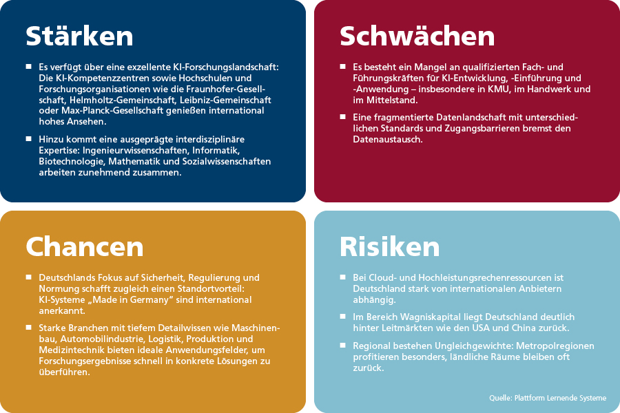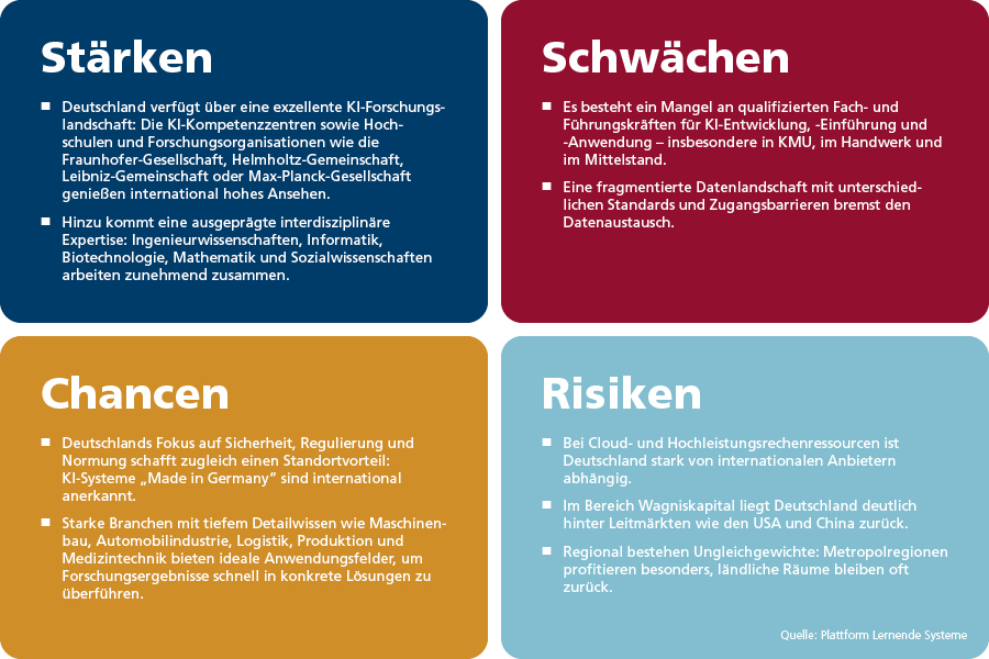 Deutschland soll ein zentraler Player für die nächste KI-Generation und im weltweiten Wettbewerb werden. Dazu sollen u. a. KI-Spitzenzentren für die Forschung gestärkt und vernetzt und Förderprogramme gestartet werden.
