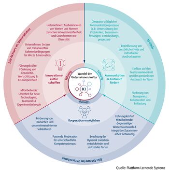 Es wird deutlich, dass nach aktuellem Stand der Forschung die Arbeit mit KI eine Unternehmenskultur erfordert, die sich bei der Einführung der Technologie auf das Ermöglichen konzentriert - durch Experimentierräume, KI-Kompetenzentwicklung und arbeitsgestalterische Ansätze, die eine Weiterentwicklung der Mensch-KI-Rollen unterstützen, flankiert durch partizipative Ansätze und klare Aussagen der Geschäftsführung zur ethischen Verantwortung durch einen KI-Kodex. Das Vorleben und Begleiten von reflektiertem Nutzerverhalten, ist dabei auch eine Anforderung an Führungskräfte. Ein kulturelles Bewusstsein für eine begleitende Rahmengestaltung ist Grundlage, um die Handlungsfähigkeit einer Organisation durch KI-Einsatz zu stärken. Es kommt wie auf der Plattform Lernende Systeme beschrieben (s. Abb. 1), auf eine innovationsförderliche Kultur durch Strukturen, Prozesse und individuelle Werthaltungen, auf Kommunikation und Kooperation an. Diese austauschorientierte Interaktion bezieht sich sowohl auf die Mensch-Technik-Interaktion als auch auf die Mensch-Mensch-Interaktion, sobald KI in einem Arbeitsbereich ins Spiel kommt.
