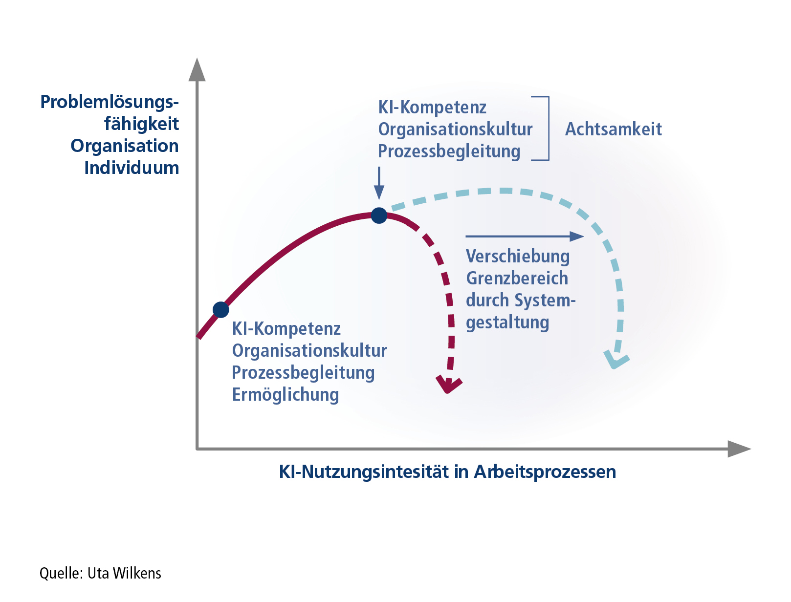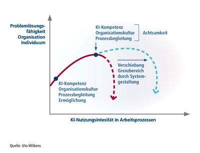 Hinzu kommt, dass durch die Interaktion mit der KI das Wert- und Normgefüge in einer Organisation dynamisch mitentwickelt wird. Dies betrifft insbesondere den Umgang mit Wissensressourcen, Wissensträgern und die Art und Weise wie Lösungen – jenseits formaler Strukturen – erarbeitet werden. Diese Dynamik schließt das technische und das soziale System ein. Der Grenzbereich der KI-Nutzungsintensität, ab wann das Problemlösungspotenzial eher reduziert statt gefördert wird, wird durch diese Systemdynamik wiederum mit beeinflusst.